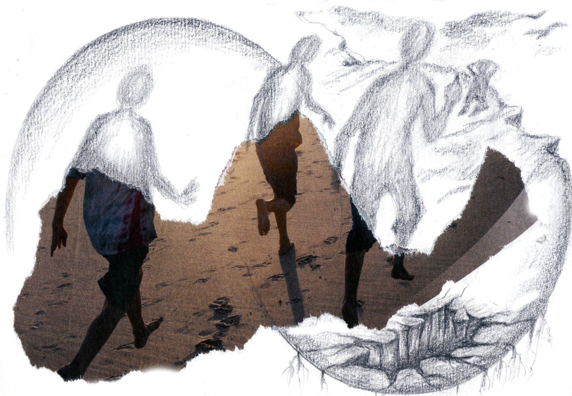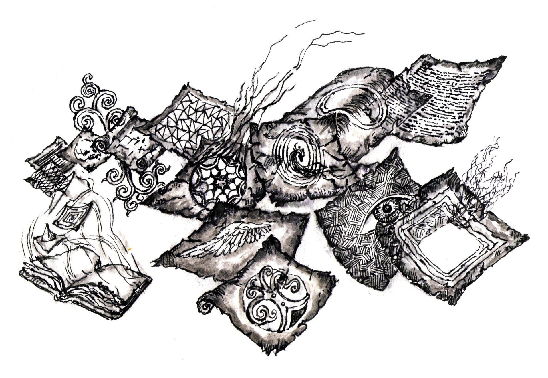 El simbolismo en este dibujo recrea un conjunto de creencias que quedan reflejadas por el libro del cual parten, llevadas por los vientos del designio y del deseo, las hojas. Las páginas en su conjunto recogen apetencias, aspiraciones, ilusiones, esperanzas, credos… Van desde la izquierda, que representa el pasado, hacia la derecha que representa el futuro. Por eso son sueños, porque elevados por los vientos, parecen volar, pero sólo es flotar, es transitorio, mientras el capricho de la brisa o del viento se digne en soplar. Hay ideales, esperanzas y sutiles deseos. Por separado o en conjunto intentan configurar la necesidad de querer darles importancia, elevarse al cielo, remontando incertidumbre y desconfianza, aunque se sepa de su fragilidad al caer al suelo, porque su esencia es elevarse del suelo. Algunos parecen desintegrarse (como el que aparece a la derecha). Apelotonados, intentando mantener su integridad, pero igualmente son juguetes del viento, movidos por a saber qué intereses, qué motivaciones, qué prioridades, qué credos y creencias. Etiquetados como sueños, pueden perseguirse, rogarles, llamarles. En su esencia también representa, como la caja de Pandora, cuando todos los males escaparon, quedando solo en el fondo la esperanza, la ilusión, el deseo que engendra los sueños, haciendo honor al refrán: “Nada es verdad, nada mentira. Todo es según el color del cristal…” con que se elige mirar.