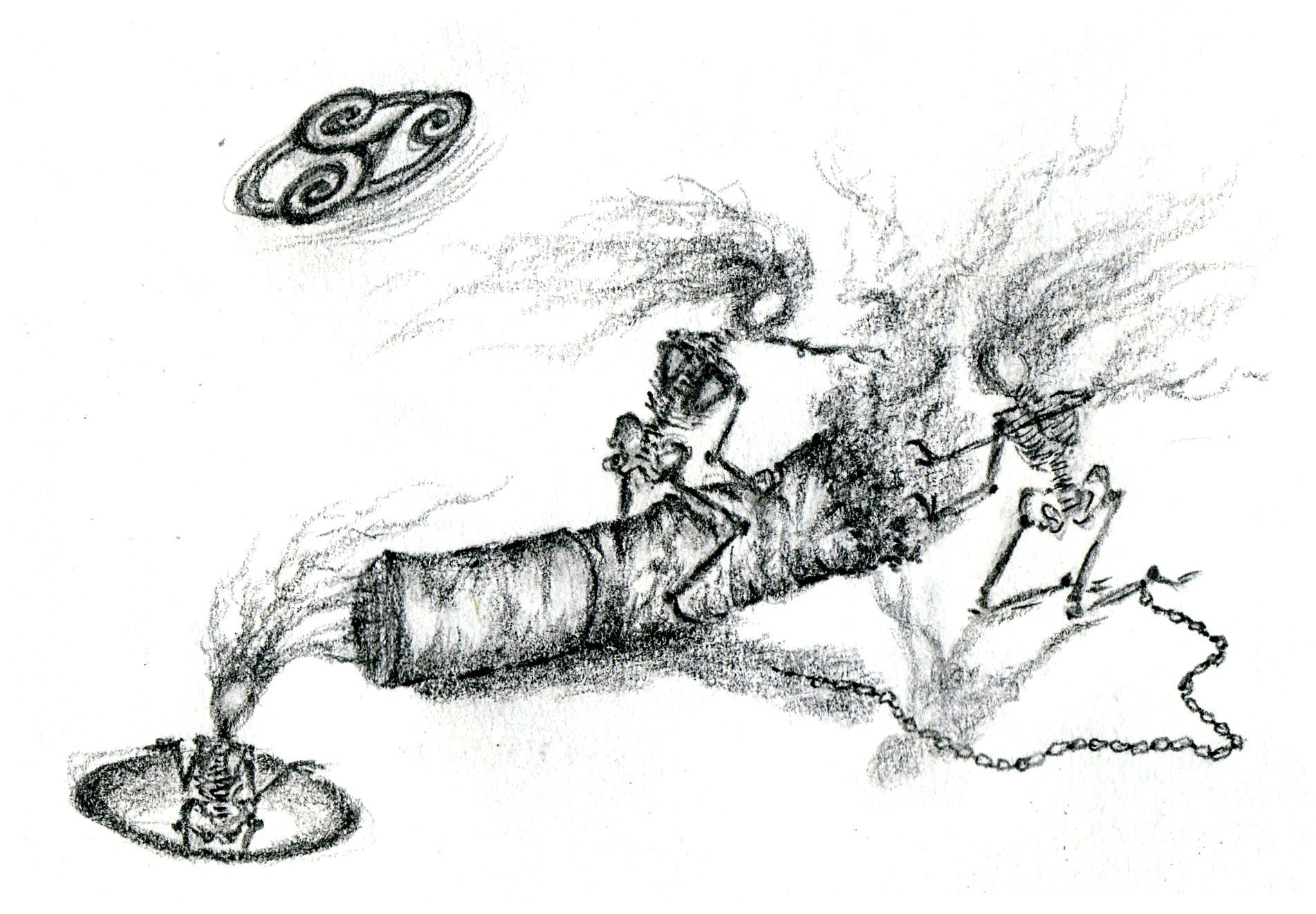 Desde el momento de nacer hacemos una diferenciación: yo y otros. Al no sentirse completo nacen los deseos, a veces disfrazados de necesidad. Entre las motivaciones más apremiantes se encuentran el buscar el placer y evitar el dolor. En la búsqueda del placer se buscan experiencias placenteras, reconocimiento, fama… No es el hecho en sí lo que encadena, sino el hábito. Dos esqueletos están encadenados, un tercero asoma curioso al mundo del “placer”. El cigarrillo simboliza el deseo, las cadenas el apego. El hábito se enlaza con la ley de economía: máximo rendimiento-mínimo esfuerzo. Lo que podría ser un ejercicio de libertad se convierte en una esclavitud, pensando que se persigue la felicidad (como suma de placeres y bienestar). Por las cabezas se difumina su esencia, como humo, sin consistencia. También los apegos intentan sustraerse al dolor, buscando el placer. El esqueleto representa haber perdido la conexión con la Esencia. A la izquierda como tutelando un proceso, el “trisquel”, un símbolo mágico, que representa el equilibrio entre alma, mente y cuerpo, como referente. En el instinto de supervivencia se ignora el equilibrio y la alienación que representan las cadenas cobra protagonismo. El humo que se desprende del cigarro representa el argumento que atenaza voluntades y mantiene el apego. El esqueleto arrodillado representa la subyugación. El apego persigue espejismos y espanta libertades.