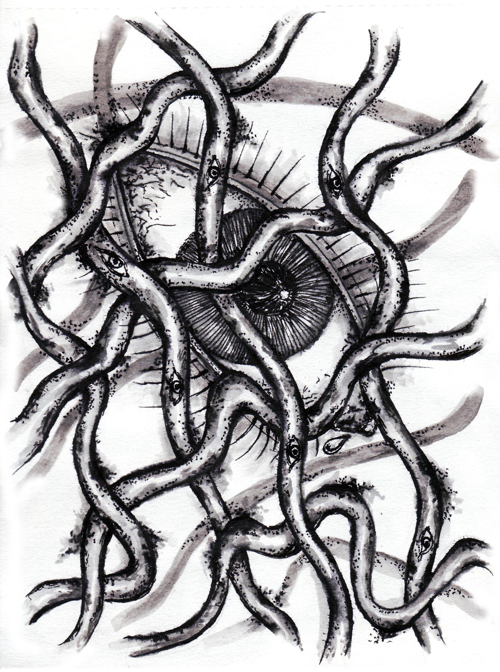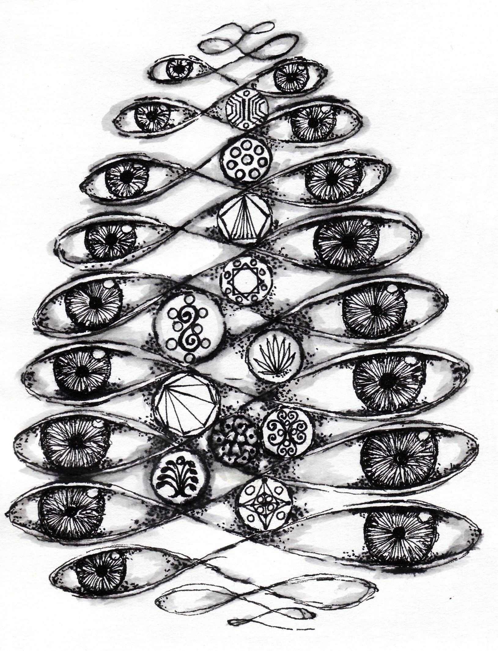 Representados por unos ojos escrutadores, indican el percatarse de… Entrelazados como un todo expresan continuidad, porque se ensamblan en la Unidad. La percepción conforma un edificio que intenta preservar la integridad. El equilibrio de lo que percibimos fortalece nuestra visión del mundo. Los referentes son el propósito de mantener cuerpo, mente y espíritu como un Todo. La consciencia es la llave que permite discernir. Los círculos entre los ojos insinúan las motivaciones que llevan a la manera de pensar, derivando actitudes y comportamientos. El punto de referencia adecuado nos permite sondear qué percibimos, en función de qué y para qué. La perspectiva, que no se debe perder, el enfoque es el aprender para ejercer el conocimiento. La consciencia nos acerca a saber qué hacer con ese entendimiento. La consciencia evita perderse en el laberinto del no querer ver, de ahí el protagonismo de la vista, no como elemento perceptivo, sino como referente para poder valorar. Querer parecerse a… realizar tareas sin tener en cuenta la ponderación del propósito aboca a la inconsciencia, a seguir derroteros que sostendrán un edificio más que dudoso. El ser conscientes es apostar por una integridad que resulta de evitar máscaras y comparaciones. Cada esfuerzo consciente por estar en el ahora es invertir en un edificio sostenible, de ahí que los ojos estén entrelazados, manteniendo un equilibrio entre percepción y deseo.