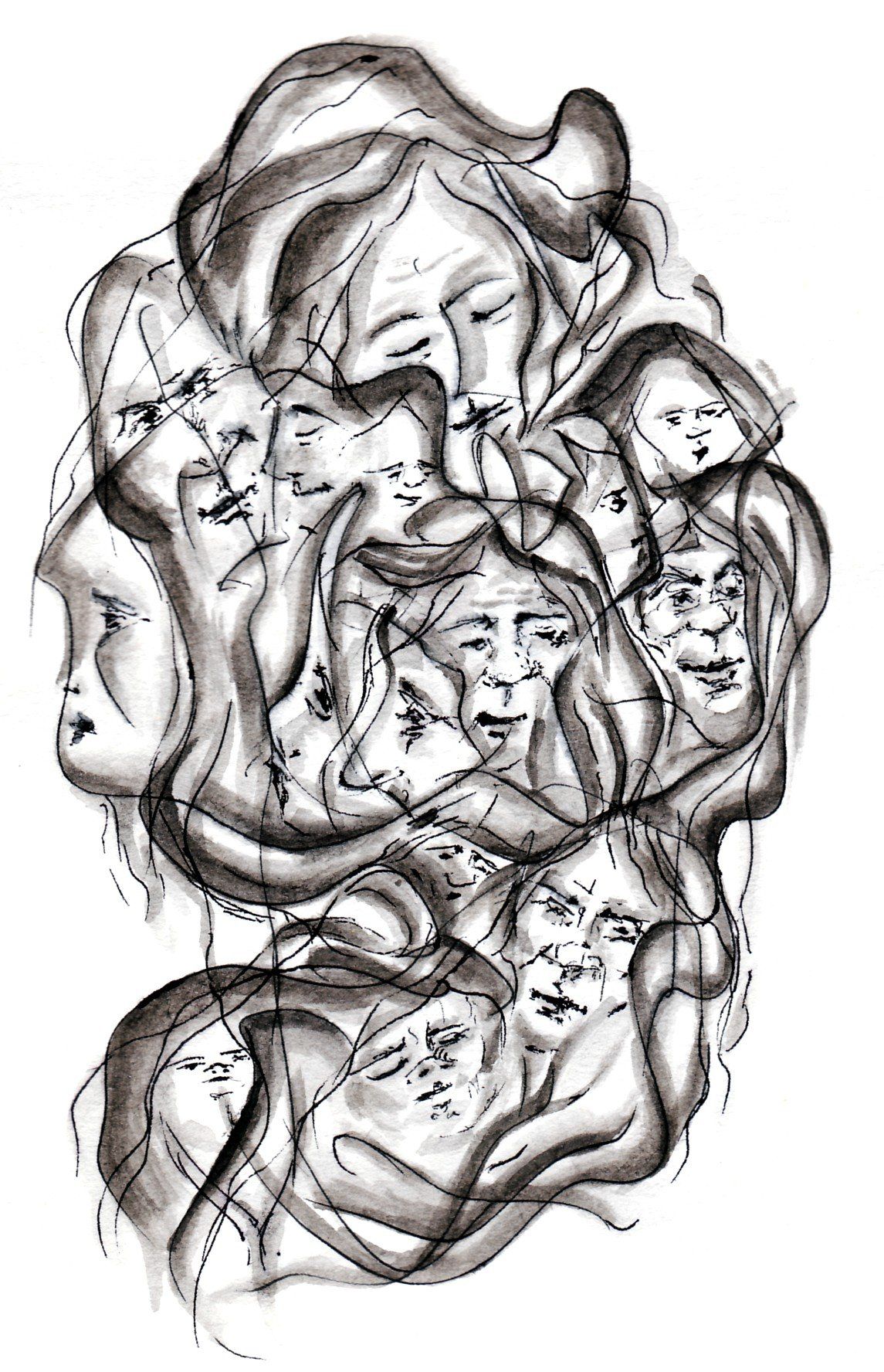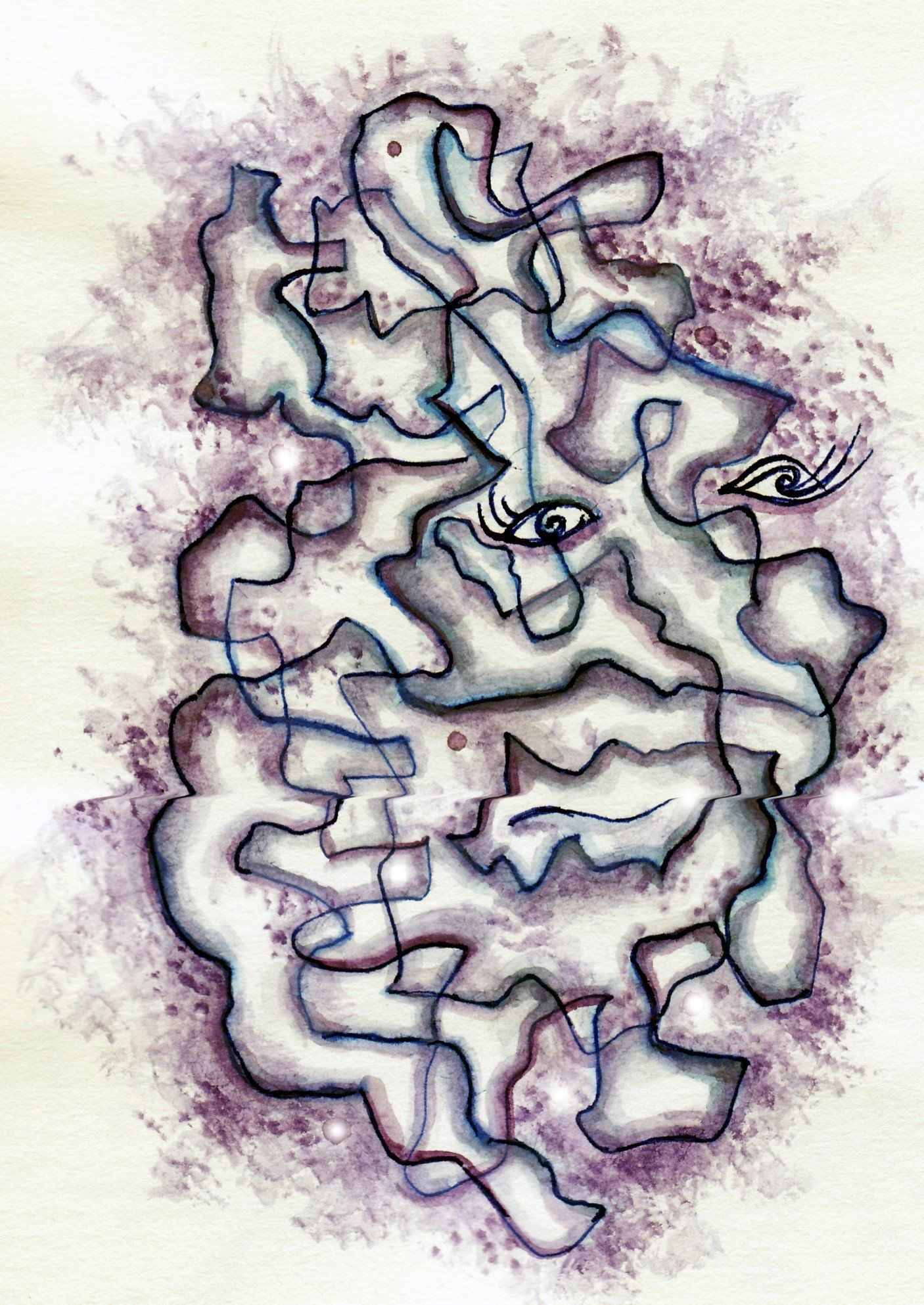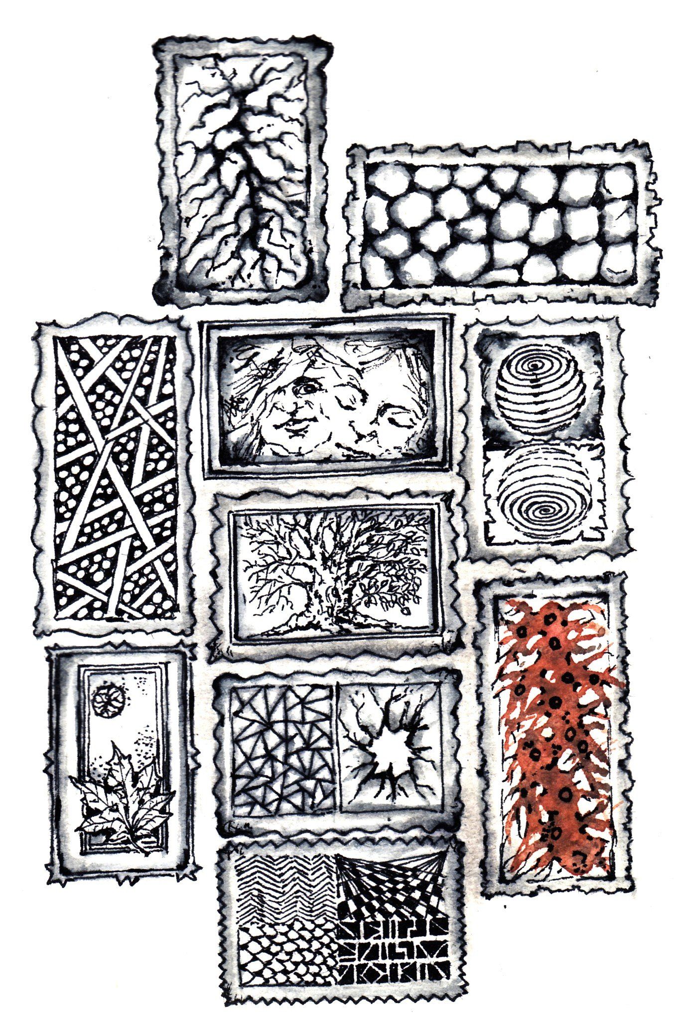 Los diez dibujos que conforman el mapa representan un todo. Diversas motivaciones, intereses, inquietudes, incertidumbres, desconfianzas… paradigmas se representan en las distintas hojas que configuran la Vida. El propósito intenta recolocar cada página para el equilibrio sea el referente. Cuando la incongruencia, el deseo, el temor y otras emociones negativas cobran protagonismo, la alienación, el no ser el que se Es, hace acto de presencia. Los diferentes dibujos que componen el conjunto son elementos recolocados según motivaciones, propósitos y prioridades. Por ello aparecen buscando un espacio, entre lo horizontal y lo vertical. A veces la intención de nuestros propósitos suele ser clara, avalada por la referencia del Ser (por ello hay imágenes figurativas) y otras no (dibujos imprecisos no figurativos). Las distintas hojas tienen el contorno irregular, indicando que es difícil que encajen como las piezas de un rompecabezas, por cuanto que las motivaciones y las expectativas suelen ser imprecisas. Es el campo abonado para la alienación, para esa pérdida de identidad. Lo que llamamos realidad, en realidad es “nuestra” realidad, es la que hemos configurado al perder de vista la Unidad, y el Todo. El cuerpo pretende hacer prevalecer el Uno ante el Todo, la mente intenta justificarlo, pero el Espíritu aboga por la Unidad.