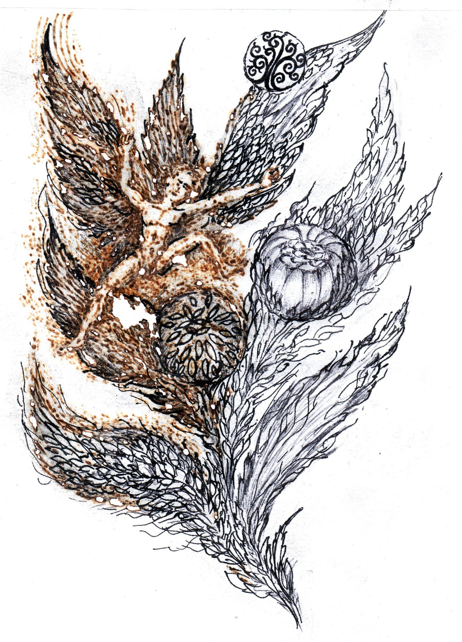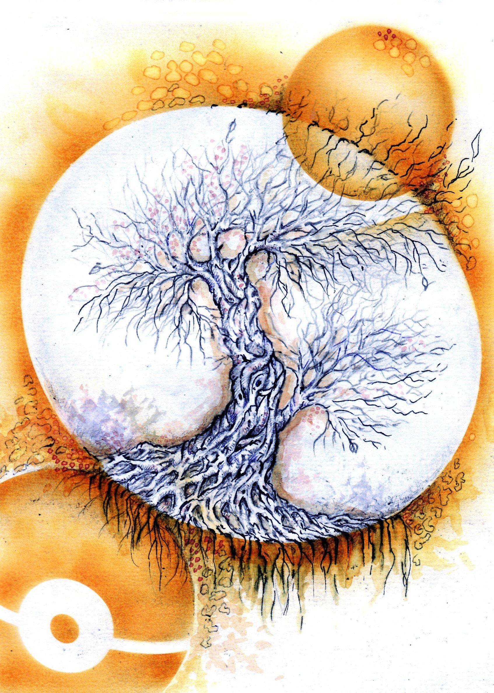El “Desarraigo” viene representado por un árbol sin hojas, balanceándose entre dos círculos que intentan equilibrarlo y sostenerlo. No quiere representar tanto la condición social del individuo sin raíces o alienado, como la desconexión con la Esencia: pertenecer a un Todo en la Unidad. Las raíces se sitúan en la esfera inferior izquierda, el pasado, elevándose hacia la derecha, el futuro. Son cortas, de poca profundidad, queriendo cobrar su espacio fuera de la desvaída elipse que lo contiene. Raíces que buscan el agua y la tierra necesaria para su sostén. En el extremo las pequeñas y escasas hojas representan la esperanza, elevándose a conectar con otra esencia: el aire y el sol. El árbol viene a representar la unión entre lo divino y lo humano, entre el cielo como condición de conciencia y la tierra, lo terreno. Los contrarios están destinados a encontrarse, porque son complementarios. El árbol con toda su carga simbólica enmarca una condición del ser humano: el desarraigo que le llevara al arraigo, a reconocer su Esencia.