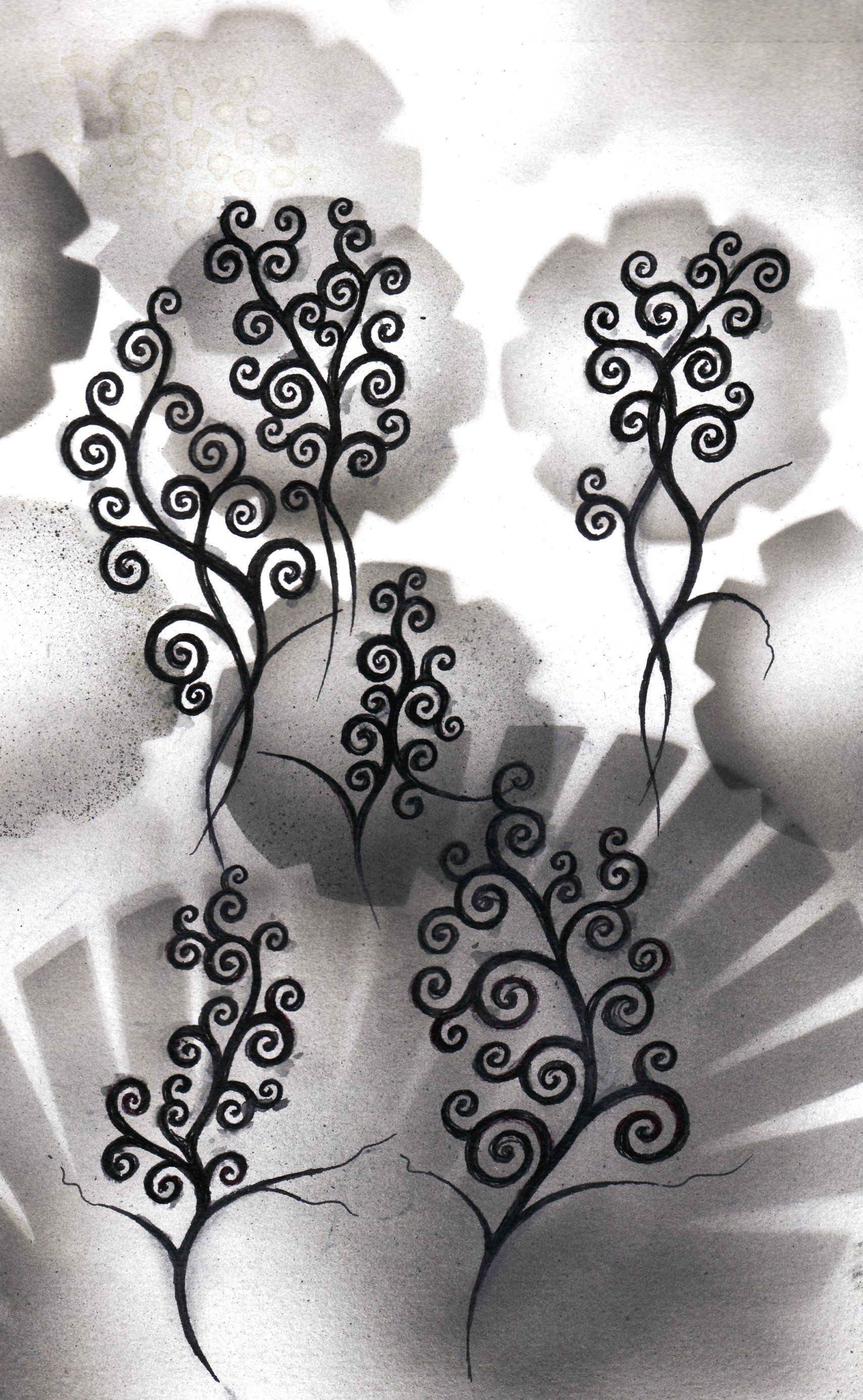 Flotando, con sensación de total ligereza, unas flores estilizadas simbolizan la atracción, algunas veces irresistible hacia un algo. Etéreas, como la fascinación, no tienen raíces, justificación. Surgen a veces de las mismas apetencias adornadas de necesidad. Deseos que cobran vida sin saber su origen ni repercusiones. En el fondo flotan junto a ellas esferas de aspecto octogonal. El ocho, las formas octogonales vienen a simbolizar la transición entre el cielo y la tierra, entre lo humano y lo divino; también la perseverancia para logros materiales y espirituales. Las estilizadas flores representan los deseos adornados como volutas, volubles y frágiles.