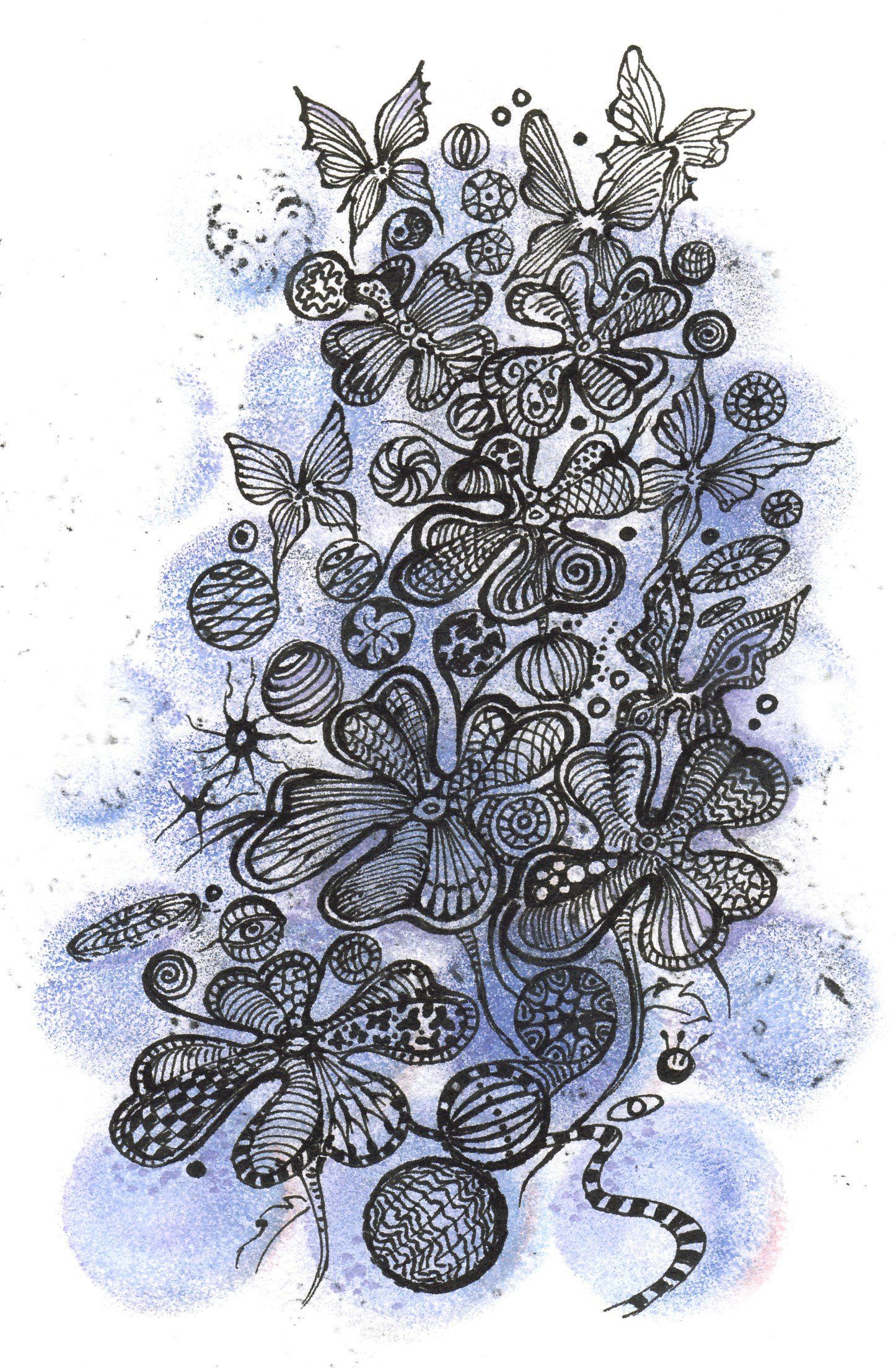 Las figuras que simbolizan mariposas vuelan demasiado juntas, representando la obstinación. Los pensamientos quieren tener libertad, flexibilidad. Cuando se aferran a alguna idea pierden esa danza de vuelo armonioso que tienen las mariposas. Sin objetivo claro, los pensamientos se atropellan, se entorpecen entre ellos, se vuelven lentos. Quizás su apego a alguna idea les hace desconfiar de su vuelo y eso, sin espacio para el libre movimiento, les vuelve vulnerables, sin alternativas, como la obstinación.