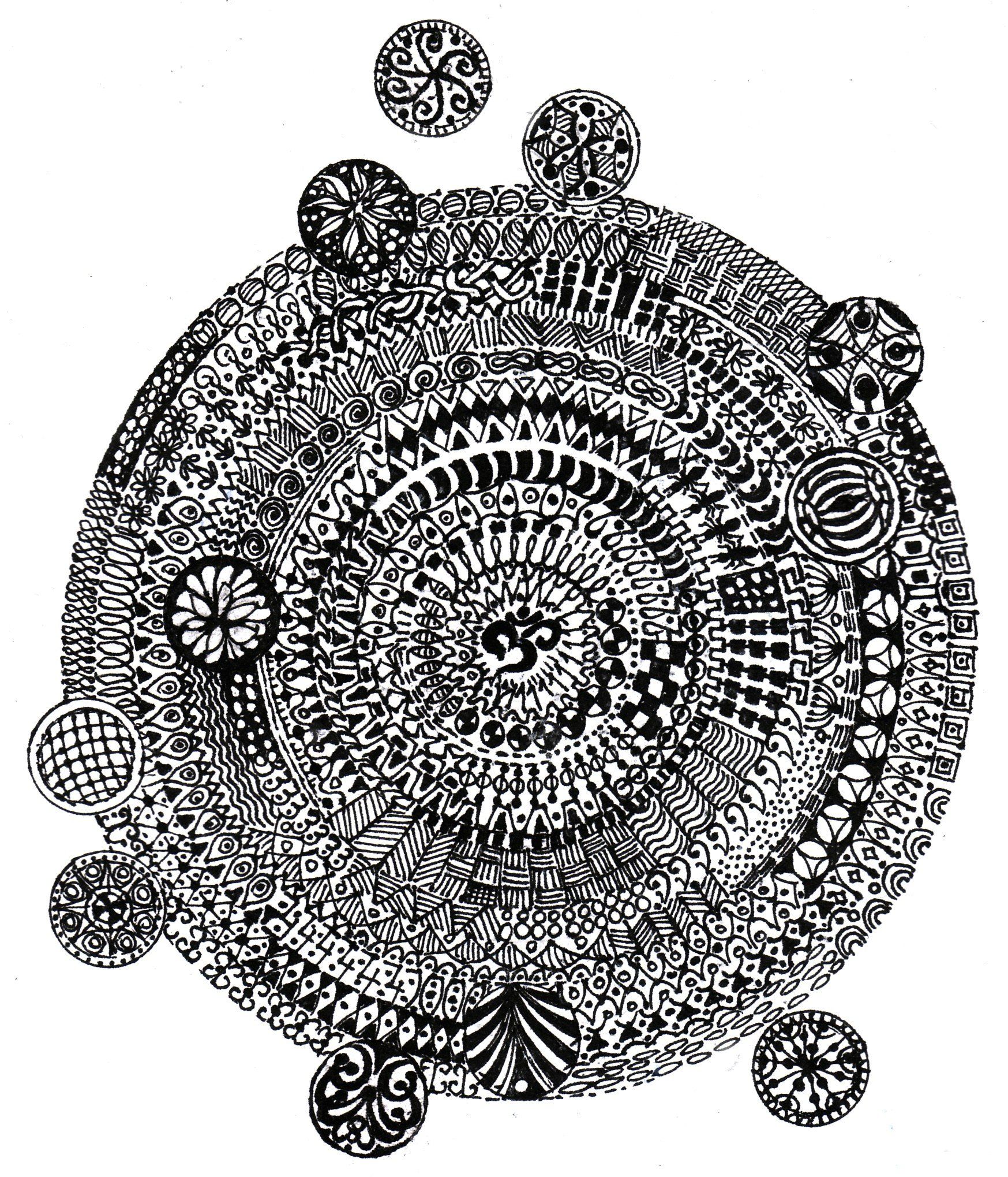 Partiendo del “Om” del centro, arropándolo y abriéndose, entre el equilibrio del círculo, se van enmarcando las cavilaciones, las reflexiones profundas, minuciosas, buscando su momento y lugar, representadas por esos círculos concéntricos, con su personalidad y riqueza plástica, aunque un tanto aprisionadas entre creencias, certezas e incertidumbres. Las pequeñas esferas de la periferia están escapando a esa primera intención de ser retenidas por el mismo proceso del pensamiento, evitando que la excesiva reflexión e indecisión acabe por aprisionarlas; no hay dos iguales, son fruto de la flexibilidad, del desapego de la libertad. No pueden ser retenidas, siguen la evolución dinámica da la existencia. Han ido conformándose de la misma esencia del deseo, de las decisiones, del fluir de la energía del pensamiento en su deseo de explorar más allá de sus limitaciones. Los diversos dibujos de los círculos concéntricos representan la esencia de la que se nutren las ideas, las reflexiones, las posibilidades de valorar alternativas y decisiones.